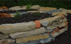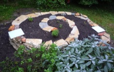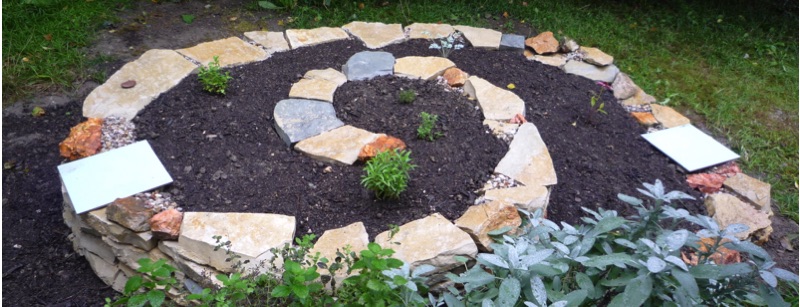 Eine Gestaltungsmöglichkeit unter Anderen. Durch das Bauen in die Höhe erhalten die oberen Kräuter mehr Licht und mehr Wärme und gedeihen prächtiger. Die Kräuter sind erhöht bequemer zu bearbeiten.